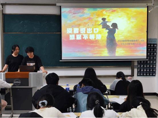 “同學們,猜一猜明天是什么節日?。俊薄澳赣H節!”5月11日,新聞傳播學類專業2023(7)、(8)班在K202教室開展以“愛要說出口,感恩不等待”為主題的團建活動?;顒娱_始前,活動負責人、新聞傳播學類專業2023(7)、(8)班的班長楊雨霏、朱研溪提前為每位同學準備好信紙和信封。朱研溪說:“我們希望通過寫信這種傳統而深情的溝通方式,讓同學們勇敢表達自己的心聲,將對母親的愛訴說于筆尖?!睂W生們觀看一段關于母愛的感人短片后,...